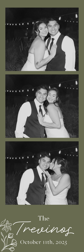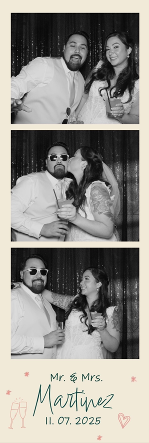 Three black-and-white photo booth pictures of a couple at a wedding, with the date November 7, 2025, and the names Mr. & Mrs. Martinez, along with celebratory graphics like champagne glasses and hearts.